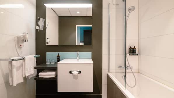 Badezimmer mit: Regendusche und/oder Badewanne und Toilette